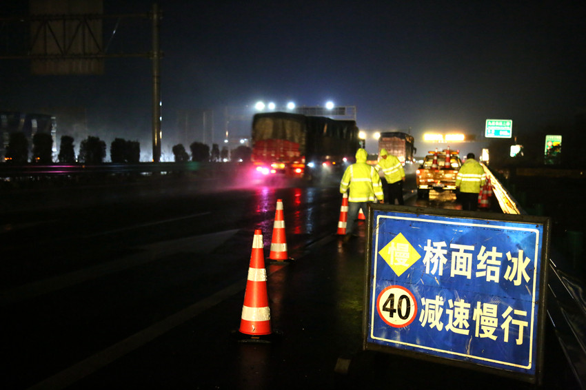 13日23时,第三次人工测量,主桥桥面温度降至0℃至-1℃,为防止路面结冰,5分钟后,抢险救援组立即赶往现场渠化交通;凌晨2时,除冰扫雪车开始上路撒布作业,对桥梁全线撒布融雪剂,安排了清障车辆在公司驻点待命,同时,沿路情报板滚动提示“雨雪天气,谨慎驾驶”,提醒过往司机注意行车安全。