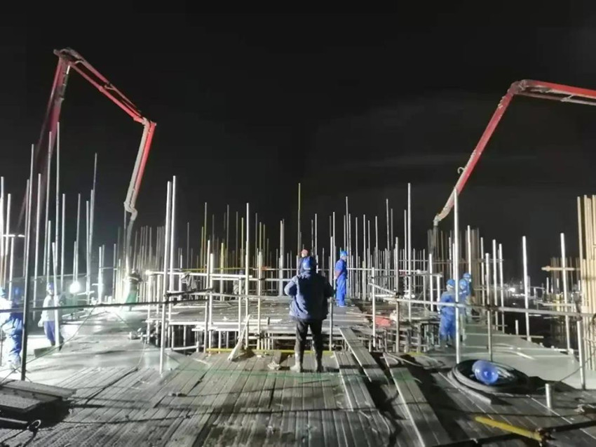 2021年1月25日下午21时16分,丰电三期#8机主厂房除氧煤仓间25.95米层及28.8米煤斗梁层在经历连续33个小时的奋战后,终于顺利浇筑完成,迈出了#8主厂房主体结构施工最关键的一步。
